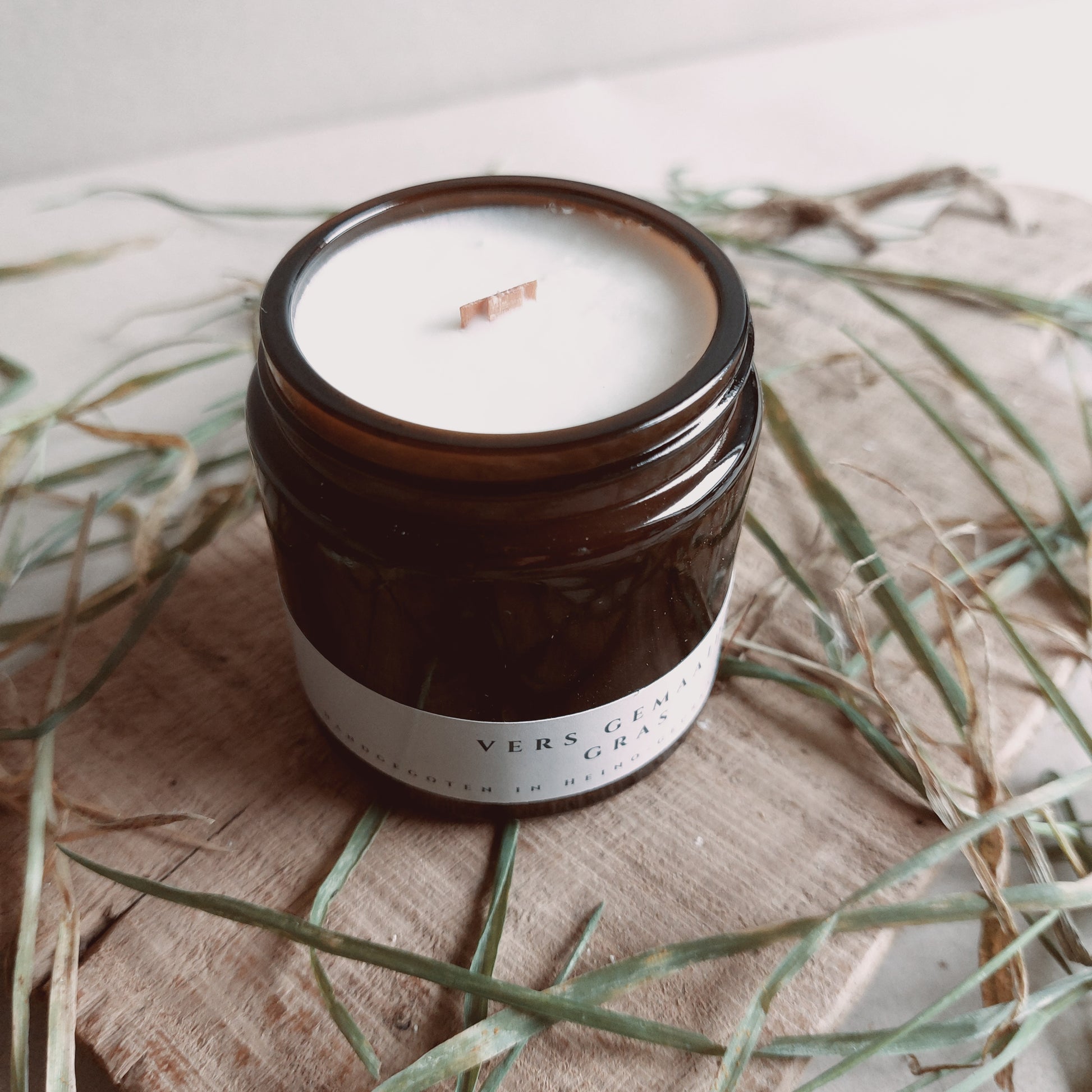 Deze kaarsen van een mix van soja met minerale wax maak ik in kleine hoeveelheden allemaal met de hand en voorzie ze van een Cedar houten lont die tijdens het branden een subtiel "knetterend" geluidje geeft. Dat maakt deze kaars leuk en uniek.